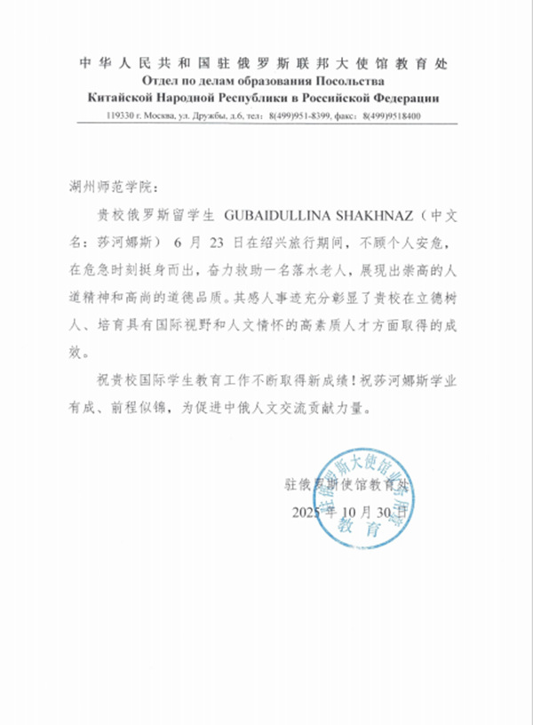 近日,中华人民共和国驻俄罗斯联邦大使馆教育处向我校致表扬信,表彰我校国际学生GUBAIDULLINA SHAKHNAZ(中文名莎河娜斯)6月23日在绍兴旅行期间,不顾个人安危,在危急时刻挺身而出,奋力救助落水老人事迹。