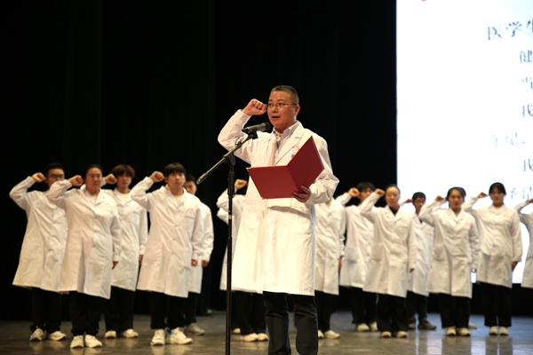 在附属中心医院副院长胡鸿宇的领誓下,2025级全体医学生庄严宣誓。这既是对医学事业的郑重承诺,更是对青春使命的庄严宣告,彰显了新一代医学生的责任与担当。
