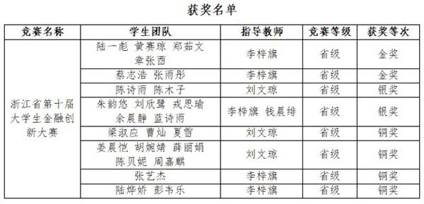 近日,第十届浙江省大学生金融创新大赛于温州商学院圆满落幕。在本届大赛中,我校代表队表现优异,共斩获金奖2项、银奖2项、铜奖4项。本届赛事吸引了来自全省57所高校的积极参与,累计提交作品达815件。竞赛设置金融创新产品设计、金融案例分析、金融创新论文等多个赛道,经过层层选拔与激烈角逐,最终在本科及研究生赛道中共评选出金奖67项、银奖100项、铜奖166项。