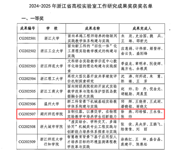 近日,2024-2025年浙江省高校实验室工作研究成果奖获奖名单正式公布。我校理学院徐燕老师主持完成的《自制仪器,以赛促学,在物理实验教学中培养学生创新能力》成果荣获一等奖。浙江省高校实验室工作研究成果奖每两年评选一次,本次全省共评选一等奖9项,我校位列其中,体现了学校在实验教学改革与创新能力培养方面的扎实成效。