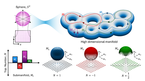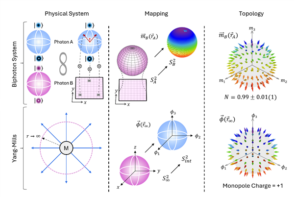 关键发现主要包括:(1) 首个仅基于轨道角动量的斯格明子:团队在由纠缠定义的两个 OAM“球面”之间,创建并测量了斯格明子/反斯格明子映射。(2) 双光子—单极子关联:同一映射对应于’t Hooft–Polyakov单极子的希格斯场渐近纹理,将光学测量与规范理论的基石相连接。(3) 高维“拓扑谱”:在维度为3、5、7时,由 SU(d) 组织的不同嵌入子流形各自携带绕数,随着 d 增大产生成千上万的候选不变量。(4) 既稳健又敏感:在现实噪声下,非平凡特征依然存在;同时可以在先前平凡的子空间中有意诱导出新特征——既有利于抗扰,也便于信道诊断。