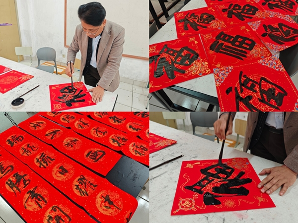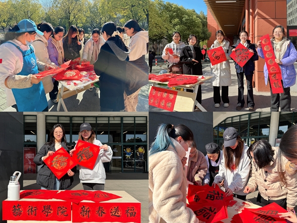为持续践行全心全意为人民服务的根本宗旨,营造喜庆祥和的节日氛围,1月14日中午,艺术学院在中校区与东校区食堂门口开展了“新春送福·党员服务”主题党日活动。活动由学院师生党员带头筹备、共同参与,通过手写春联、福字及制作新春挂件等特色形式,为全校师生送上诚挚的新春问候与组织关怀。