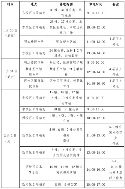 因电力设备检修、保养施工需要,定于2026年1月30日-31日、2月2日对相关电力设备开展维护作业。届时,东、中、西校区部分区域需临时停电、停水。具体安排及相关事项通知如下: