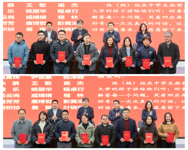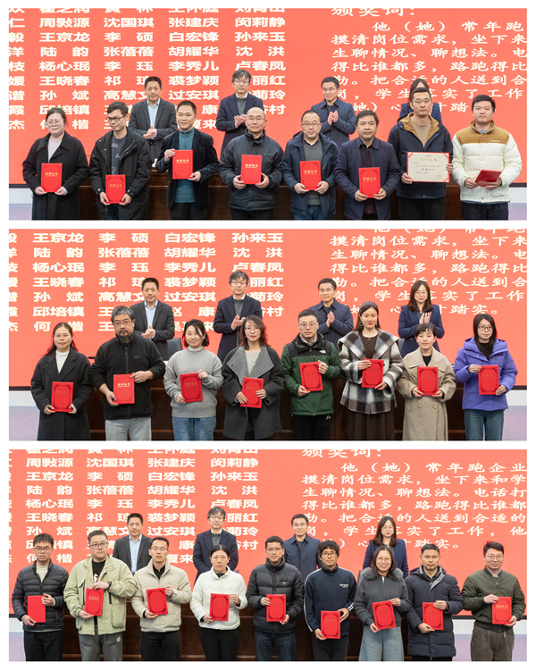 舒志定宣读表彰文件。人文学院、音乐学院、理学院、生命科学学院被评为2025年度招生工作先进集体;经济管理学院、马克思主义学院、教育学院(教师教育学院)、外国语学院被评为2025年度就业工作先进集体;吴勇辉等18人被评为2025年度招生工作先进个人;吕欢欢等44人被评为2025年度就业工作先进个人。