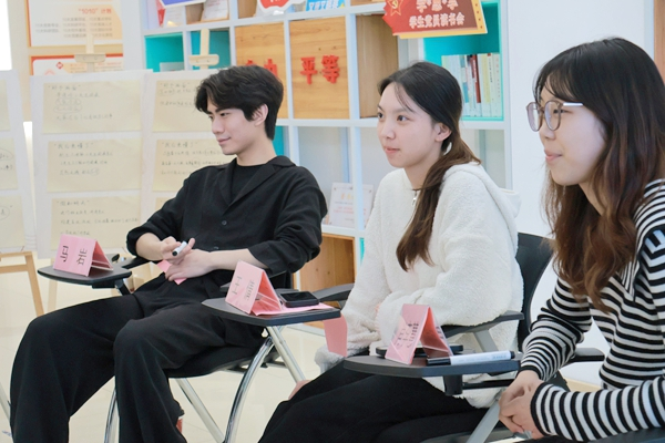 在“写下你的三行字”环节,每位参与者拿到一块三格KT板,分别填写“那个画面”“我后来懂了”“假如明天”。同学们纷纷写下回忆与畅想,然后轮流上台,将写满故事的KT板插入展架,一面“2026迎新故事墙”渐渐成形。不同的故事引发了很多共鸣,“大学教的第一课是独立”“迎新不是一群人临时凑在一起帮忙,而是一套完整的服务链”——这些来自学生的朴素洞察,成为整场活动最宝贵的收获。
