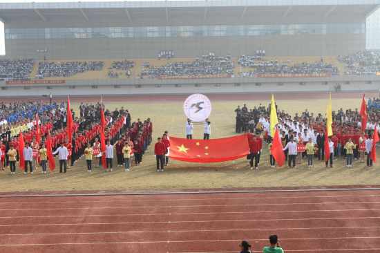 在雄壮的运动员进行曲中,入场式拉开序幕,国旗手、校运动会会徽队、花束队、彩旗队以昂扬的姿态,矫健的步伐依次进场,展现出我校师生的高昂斗志。