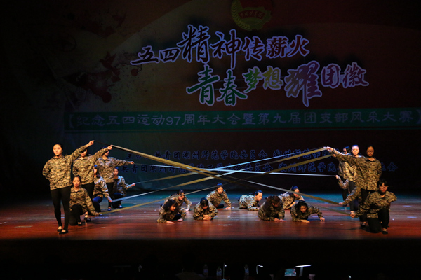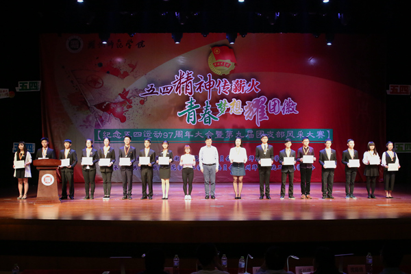 表彰大会之后,团支部风采大赛正式拉开序幕。此次决赛分为风采展示和才艺表演两个环节。在风采展示环节,各学院团支部凭借多样的创意,通过视频、ppt等方式彰显各支部在各个方面的精神面貌,将当代青年的青春梦想绽放在舞台上。才艺展示环节,各支部别出心裁,匠心独运,给在场的观众带来了一次又一次的视觉享受。工学院20132836团支部演绎了一场班级婚礼。一封感人肺腑的书信彰显了支部凝聚力,动情地诉说着支部中的美好回忆,结尾的航模展示更是展现了工科学子的专业特色。“我承诺不做虚假广告!做一名有良心的广告人!”伴随着一声声诺言,文学院20130423支部则依托他们的专业特长,展现属于广告人的青春梦想。体育学院20130312支部则以协调一致、配合默契的表演赢得了在场观众的阵阵掌声,他们动作整齐划一、身姿遒劲有力。而外国语学院20150511团支部带来的《月亮的后裔》则以飒爽的英姿、有力的节奏抓住了每一位观众的心。各支部尽显专业本色,体现青春风采,庆贺学校办学百年,传承“五四”精神。