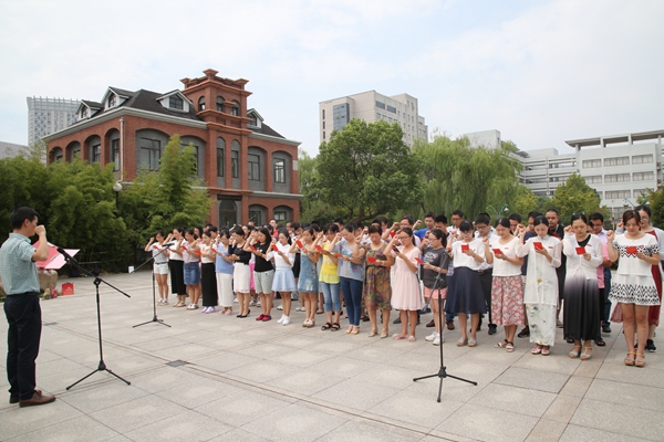 张立钦校长的报告结束后,学校在胡瑗广场举行了新教工入职宣誓仪式。全体新教工在李祖欣教授的领誓下,庄严宣誓,立志成为一名光荣的大学教师。掷地有声的誓词,紧握高举的右拳,是每一位新教师的自我期许,更是对教育事业和师院的庄严承诺。