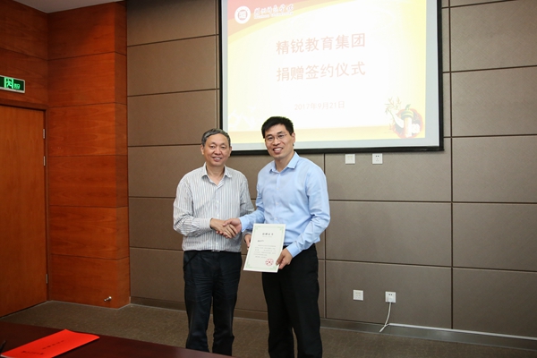 9月21日下午,我校举行精锐教育集团捐赠签约仪式。校纪委书记朱鸿和精锐教育集团高级副总裁董祝秀出席,精锐教育集团浙江分公司总经理方立军、人力资源部经理祝媛圆,我校对外联络处、团委有关人员以及学生代表参加了仪式。