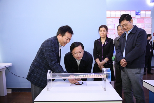 高屹一行第一站来到理学院创业展示厅,理学院众创空间负责人向高屹一行介绍了理学院中小学课程、教具等学生创业研发成果以及师生科创成果、获奖情况等,并演示了部分成果的工作原理及使用方法 。