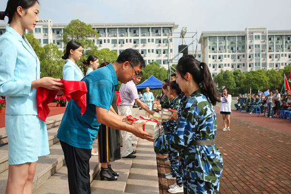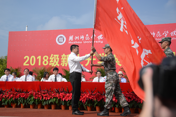 在军训动员大会上,张立钦代表学校向军训团授旗。