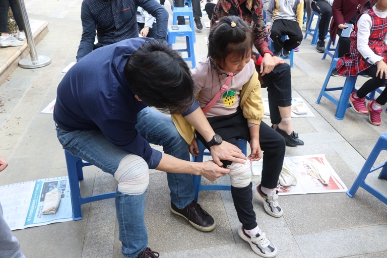 培训班的主讲内容为现场创伤急救(包括止血、包扎、固定、搬运四大基本技术)和徒手心肺复苏(CPR)。活动前半部分,主讲人介绍了主要应对烫伤、气道异物梗阻等生活中常见状况的应急措施。之后,还向居民们讲解了常用的包扎和心肺复苏等更为专业的急救知识。活动中,志愿者积极参与,上手练习包扎及CPR操作,居民也踊跃尝试,不少居民还在活动结束后继续向培训人员请教操作的方法。