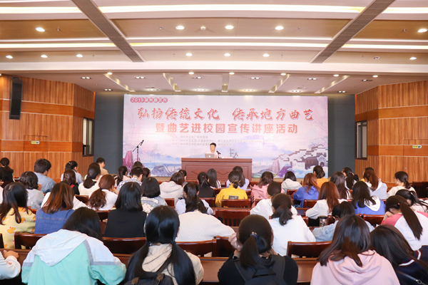 10月23日下午,由湖州市文化广电旅游局主办、湖州市文化馆(非遗保护中心)、浙江省非物质文化遗产传承教学基地(湖州师范学院)承办、湖州发展研究院、湖州师范学院国学社协办的“弘扬传统文化传承地方曲艺暨曲艺进校园宣传讲座活动”在东校区大会堂四楼报告厅顺利举办。活动特邀中国曲艺家协会会员、著名相声演员李寅飞担纲主讲,湖州发展研究院执行院长李学功教授主持,湖州市文化馆(非遗保护中心)相关负责人,及湖州师范学院200余位学生亲临现场聆听。