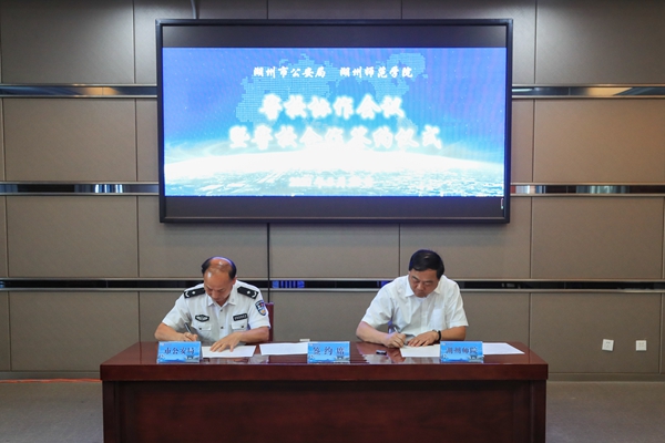 5月20日上午,湖州师范学院与湖州市公安局警校协作签约仪式在我校举行。校党委副书记陈永华,湖州市公安局党委副书记、常务副局长李泽福代表警校双方签约。校党委委员、组织部长何小青,校党委委员、宣传部长杜宁,湖州市公安局副局长梅旗华,吴兴区副区长、公安分局局长周兴强以及警校相关部门负责人出席仪式。会议由杜宁主持。