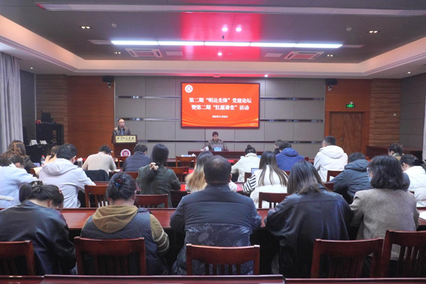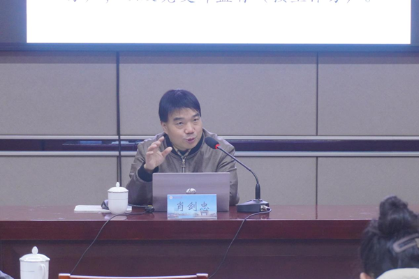 11月26日下午,学校第二期“明达先锋”党建论坛暨“红蕴人文”组织员工作室第二期“红蕴课堂”活动在明达楼230会议室举办。活动特邀浙江工业大学马克思主义学院教授、中共浙江省委党校全面从严治党研究中心研究员肖剑忠作题为“如何高质量开展党建研究工作”的专题讲座。校党委组织部副部长郭胜,“四强”组织员培养对象、在湖高校骨干组织员培养对象等30余人参加活动。活动由人文学院党委书记程龙主持。