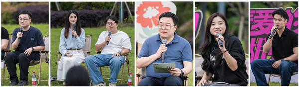 社会合作办谢杭老师回望自己和很多校友近30年的成长故事以及学校艰苦奋斗的历程,表达了对母校的眷恋。教育学院(教师教育学院)研究生朱宏伟以《竹石》明志,讲述了个人奋斗历程:从跨专业考研、发表CSSCI论文、调研报告被省教育厅采纳,再到考取华东师范大学博士生,他让奋斗成为青春最坚实的底色。经济管理学院本科生、退役大学生士兵洪轶忻表示,自己完成了通信兵任务、重要会议安保任务等,退役返校后,他继续成长蜕变、奋勇前行。艺术学院研究生曾双双讲述了自己扎根顾渚村,设计品茗三绝海报、紫笋茶包装、跑山赛,赢得村民信任的经历。理学院陈浩严副教授、毛玉平老师以《致橡树》共勉,讲述了相识相知的过程,他们博士毕业后双双回母校任教,在奋斗中彼此成就,以相伴共抵远方。交流中,现场观众时时与分享嘉宾提问互动,现场氛围热烈。